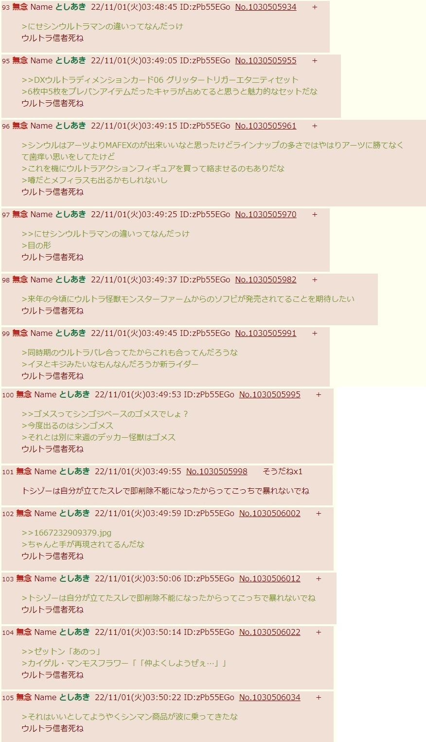 | … | 57無念Nameとしあき26/01/18(日)01:59:43No.1380919024+ 1768669183320.jpg-(320557 B) 俺は夜に立ってた特撮玩具スレが朝になっても残って伸びてるから玩具バレでもあったのかと思ったら画像のように深夜に荒らされてて雑魚粘着の存在知ったわ |