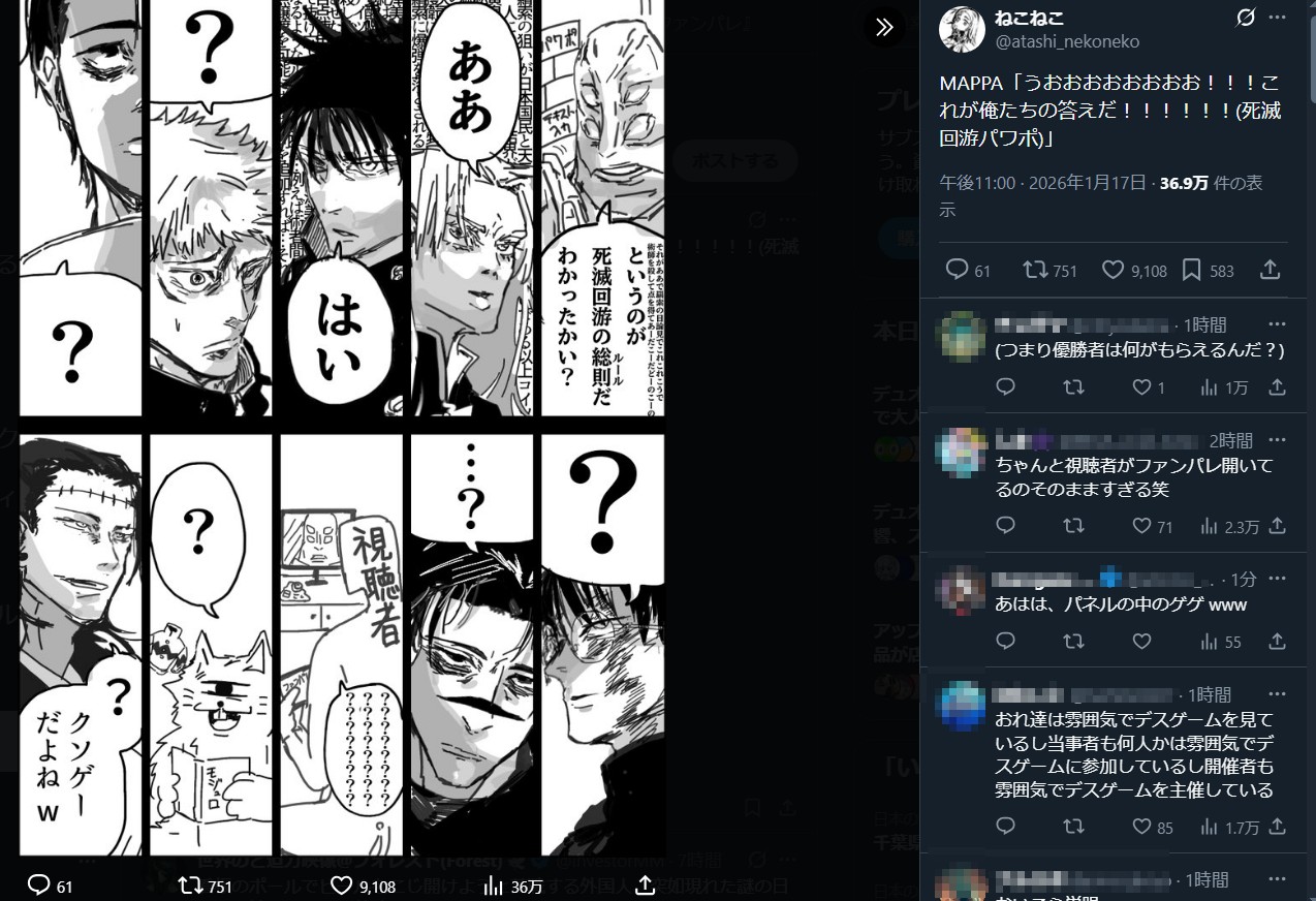 | … | 143無念Nameとしあき26/01/18(日)20:19:53No.1381117408+>鬼滅の有名編集のなんでマンは呪術廻戦の担当でもあった |