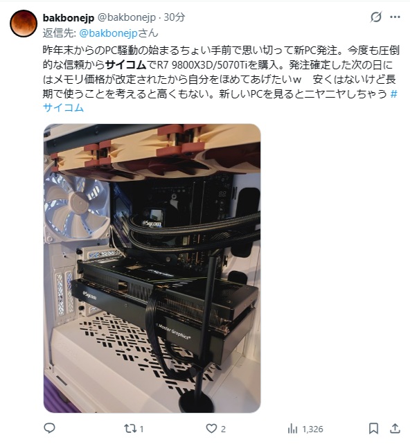| … | 82無念Nameとしあき26/01/18(日)20:02:10No.1381111473そうだねx1サイコムって他のショップより高いけど構成と納期早いのがウリじゃなかったっけ |