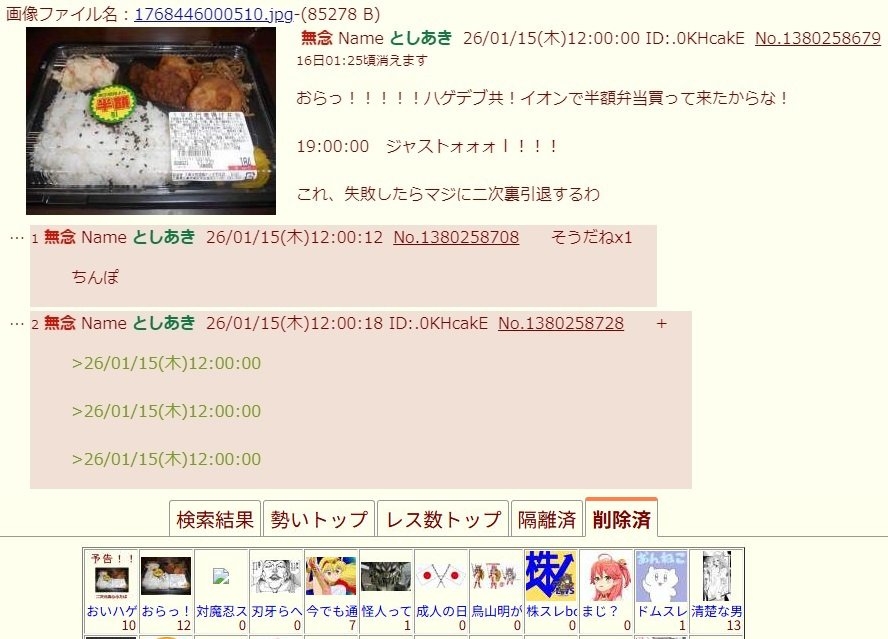 おらっ!!!!!ハゲデブ共!イオンで半額弁当買って来たからな!削除された記事が2件あります.見る