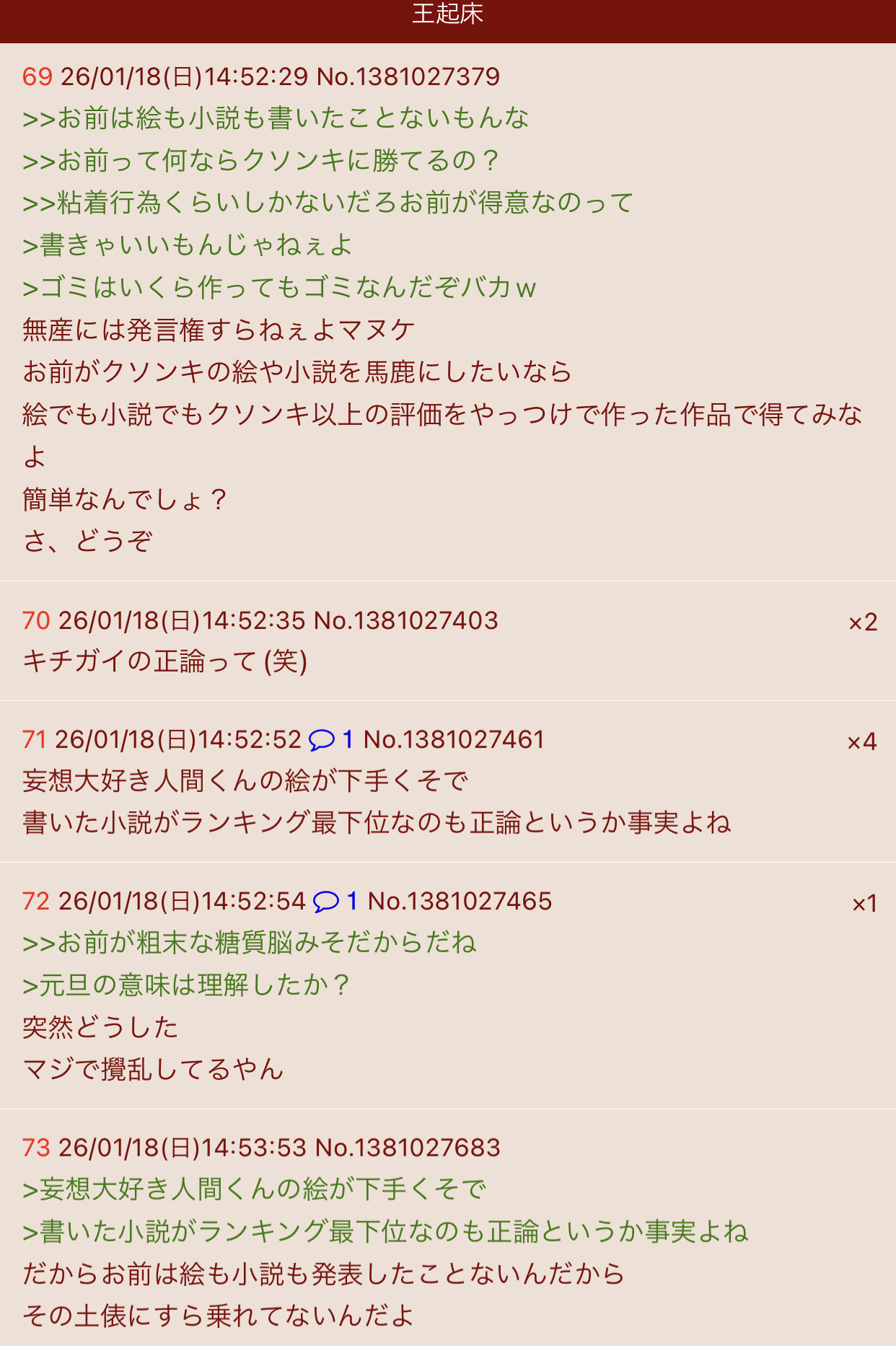 | … | 68無念Nameとしあき26/01/18(日)19:41:37No.1381104568そうだねx2>何か今日はスレ豚のコピペ芸に勢いがないな🥺 |
