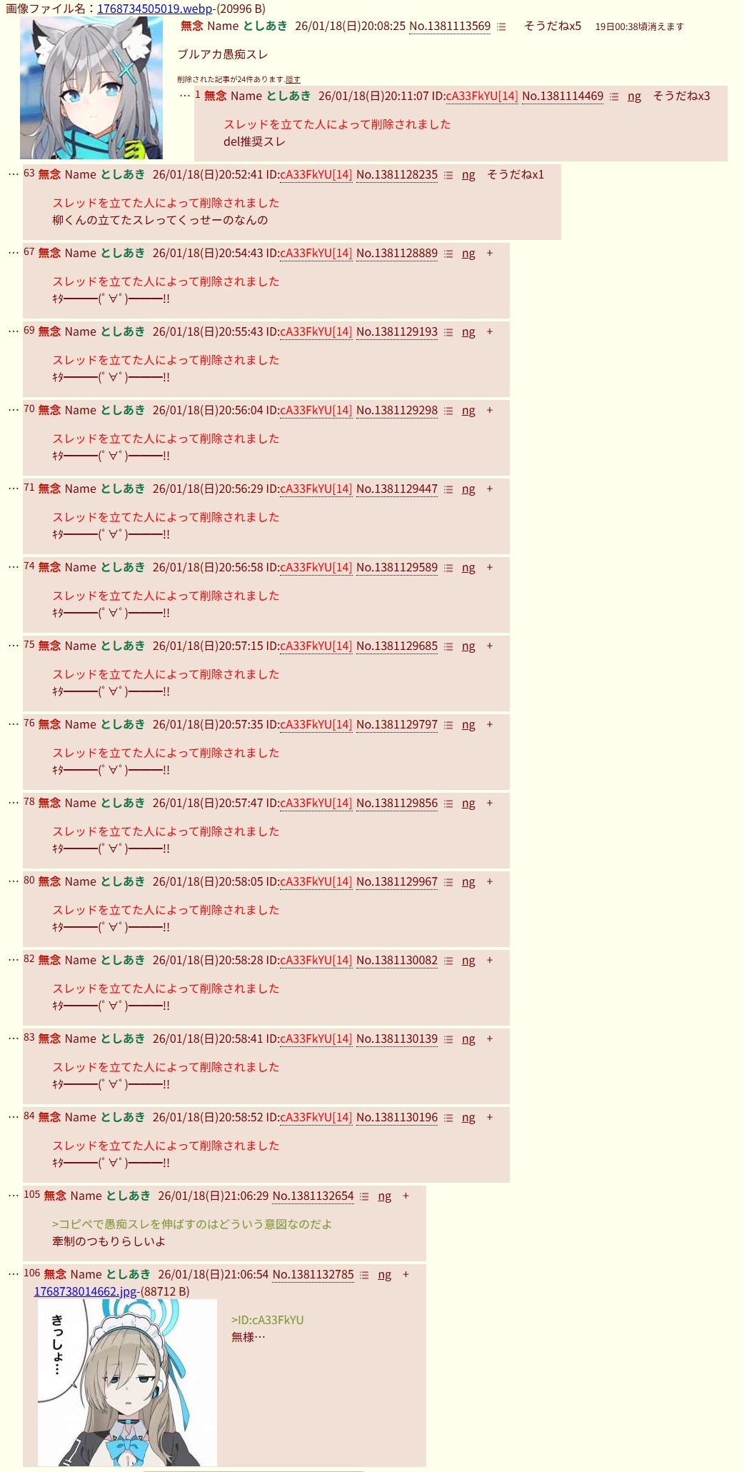 | … | 17無念Nameとしあき26/01/18(日)20:20:13No.1381117530そうだねx22>普段から謎のスレ爆破とかしててブルアカスレも荒らしの被害者だったはずだが |