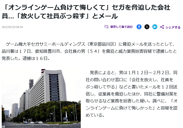 ゲーム機大手セガサミーホールディングス(東京都品川区)に脅迫メールを送ったとして、品川署は17日、愛知県豊川市、会社員の男(54)を脅迫と威力業務妨害容疑で逮捕したと発表した。逮捕は16日。削除された記事が6件あります.見る