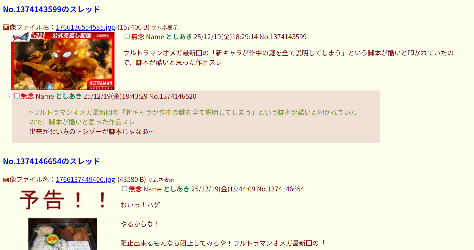 | … | 76無念Nameとしあき26/01/19(月)02:41:34No.1381204086そうだねx1>ウルトラマンのスレ文を消し忘れて |