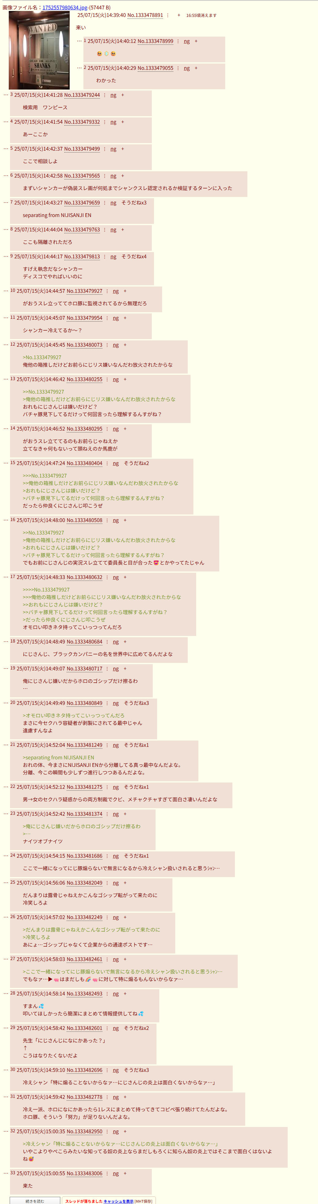 | … | 57無念Nameとしあき26/01/19(月)01:17:31No.1381197343そうだねx15 1768753051905.jpg-(1124476 B) 虹裏のVスレを崩壊させたのはにじリスって誰も忘れてないからダメだよ |