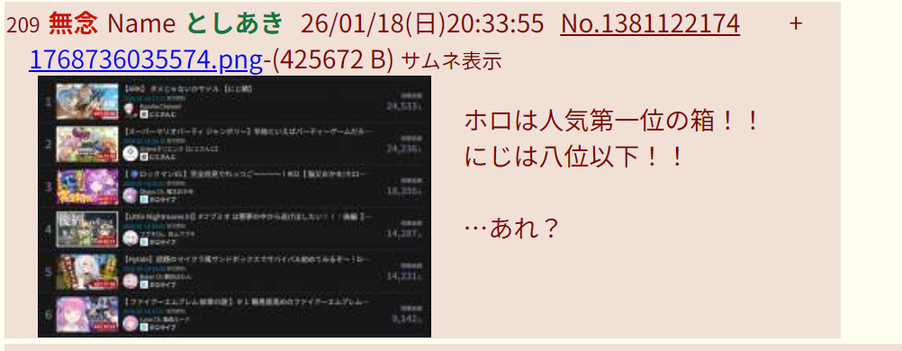 | … | 58無念Nameとしあき26/01/19(月)01:18:06No.1381197412そうだねx11>ホロがにじさんじ関係なくバカにされてる |