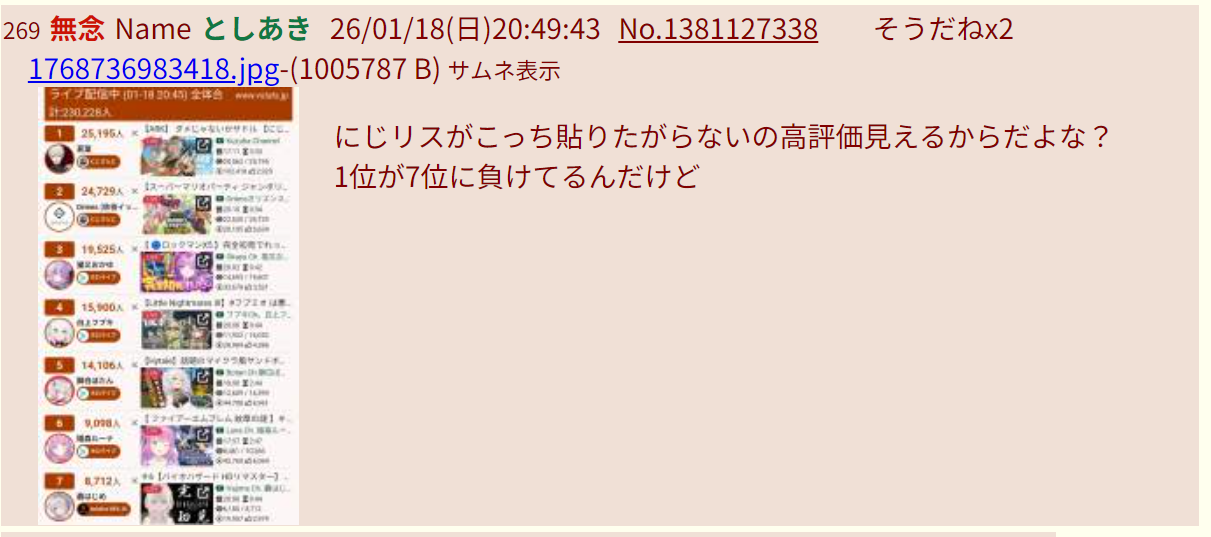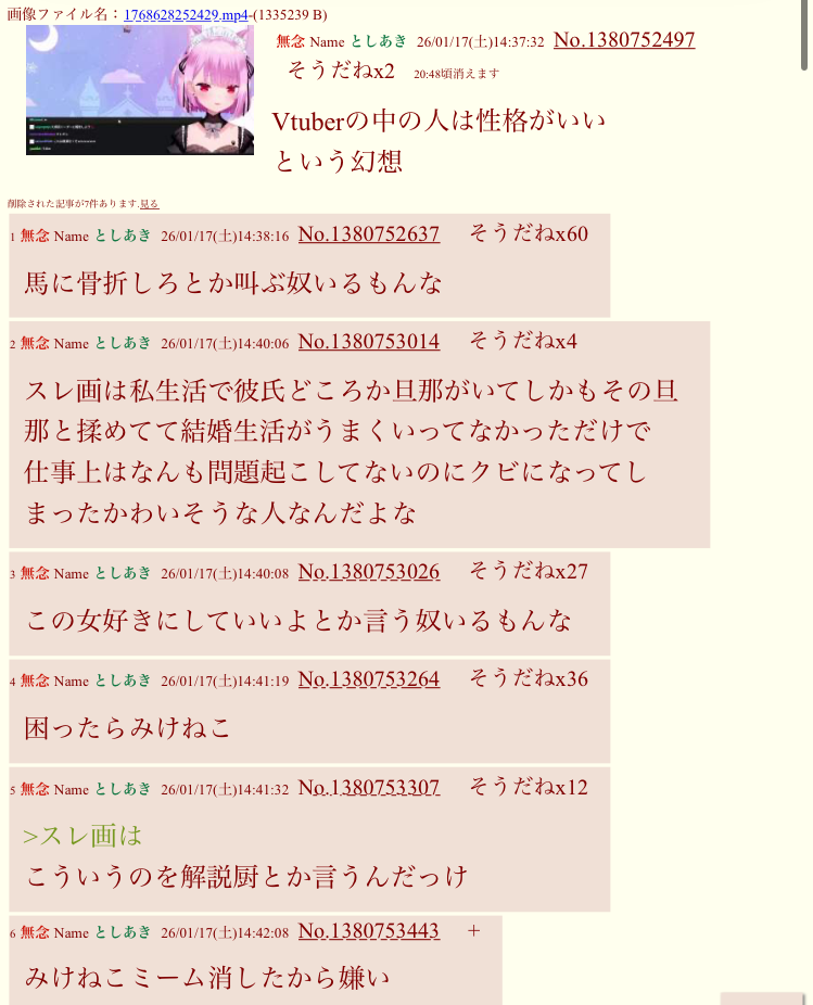 | … | 17無念Nameとしあき26/01/19(月)00:57:25No.1381194857そうだねx16>にじリスだけじゃなくて普通にVtuberアンチも多いからな |