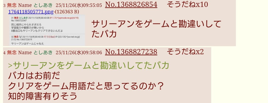| … | 210無念Nameとしあき26/01/19(月)07:24:16No.1381213137+>二次裏にはキチガイ以外の人もいると思いますけど・・・ |