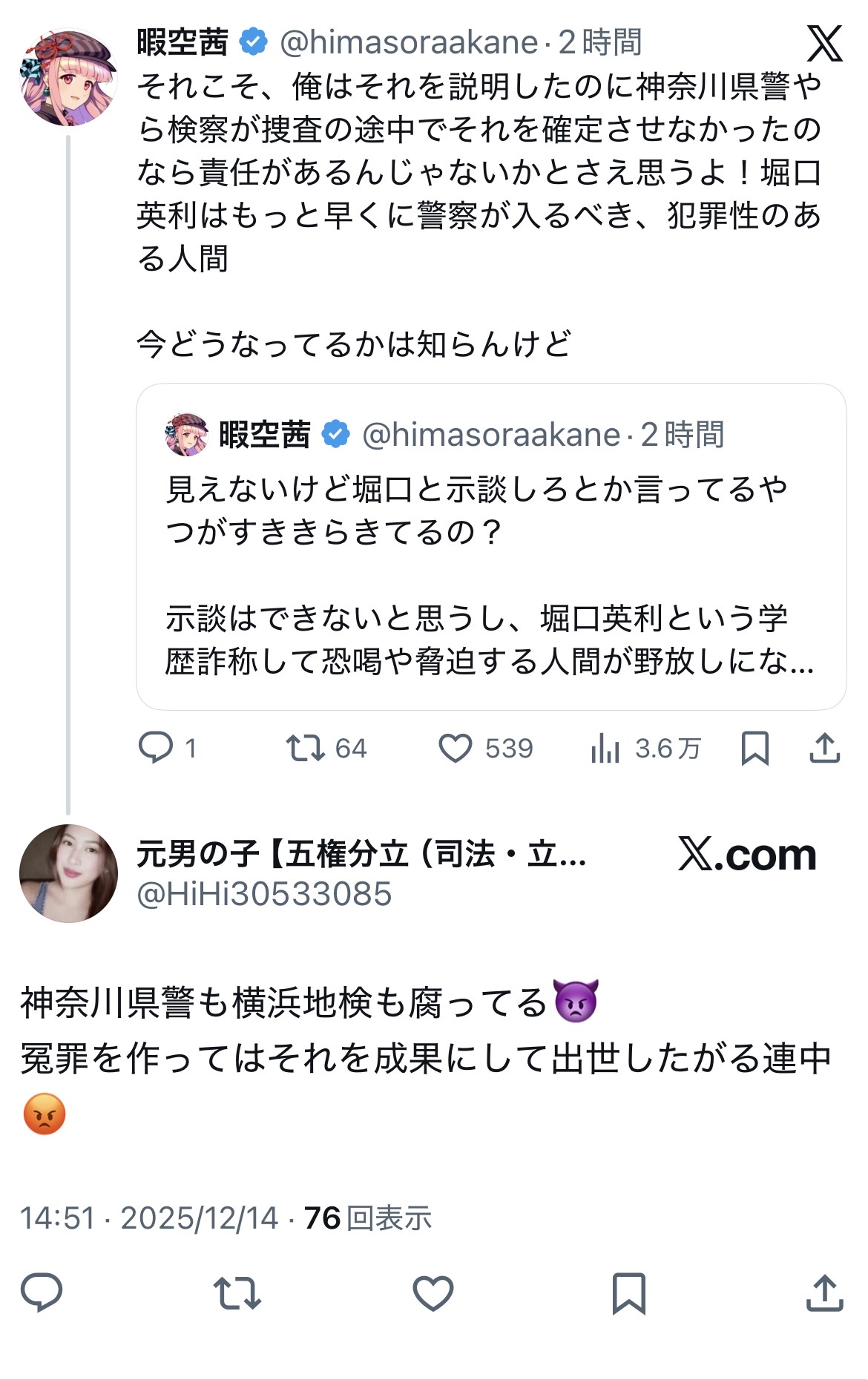 | … | 58無念Nameとしあき26/01/19(月)01:35:30 ID:EzfdYM.ENo.1381199215そうだねx3 1768754130719.jpg-(398272 B) 警察や検察にナチュラルに喧嘩を売る暇空と暇空信者 |