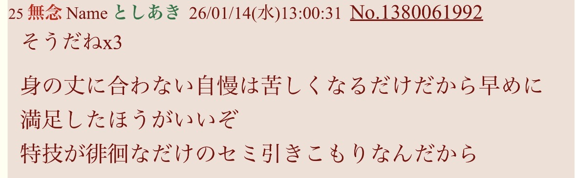 | … | 199無念Nameとしあき26/01/19(月)06:46:26No.1381210827+うんぼくはヒキコモリです |