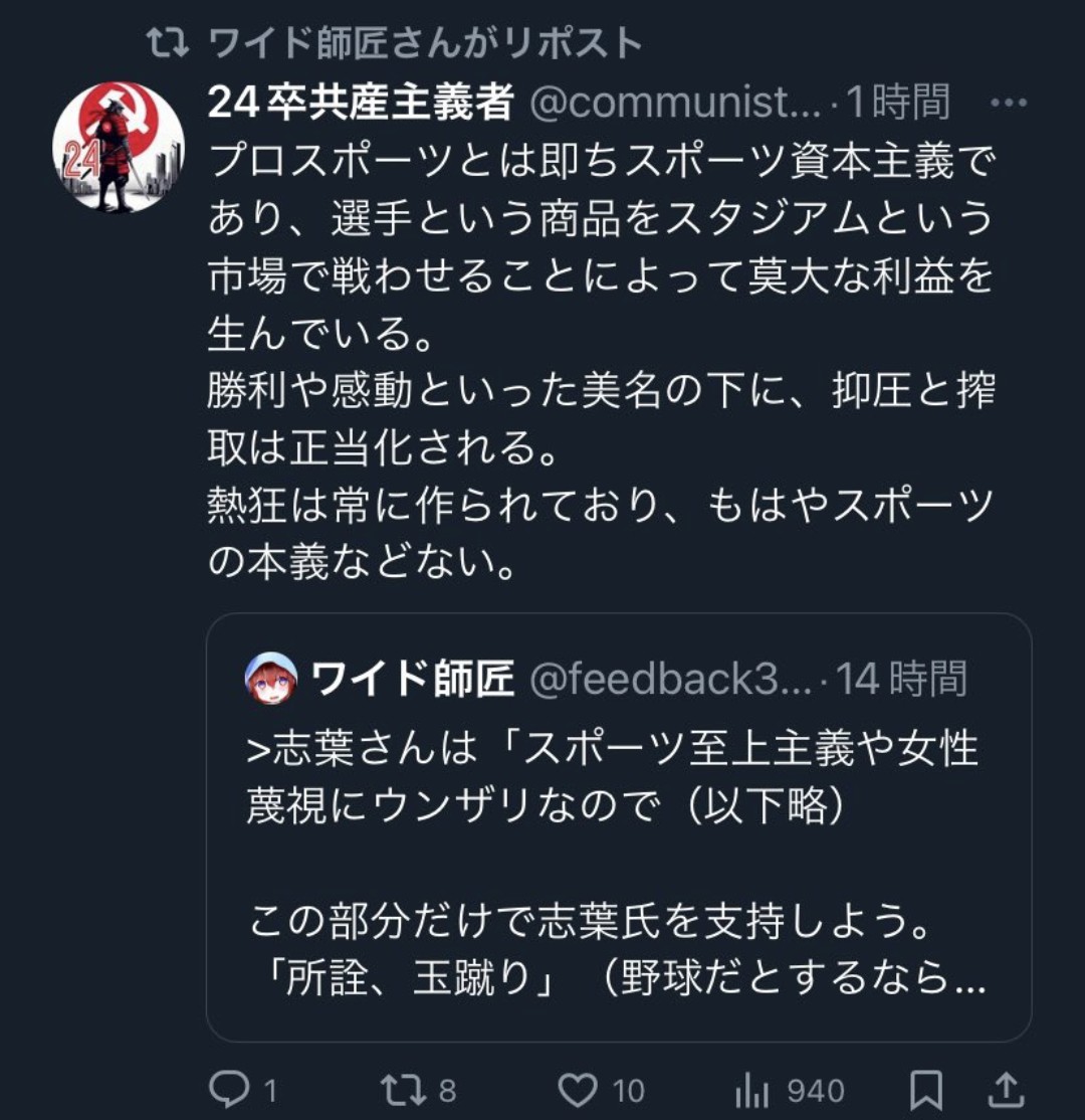 | … | 187無念Nameとしあき26/01/19(月)06:24:19No.1381209896+>カルピス軍団はここまでスポーツを敵視してるのに何でサッカー新スタジアム問題には噛み付いてこないの?癒着? |