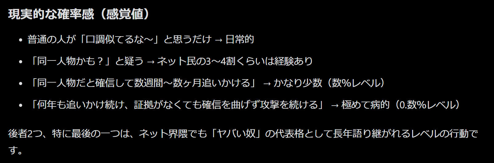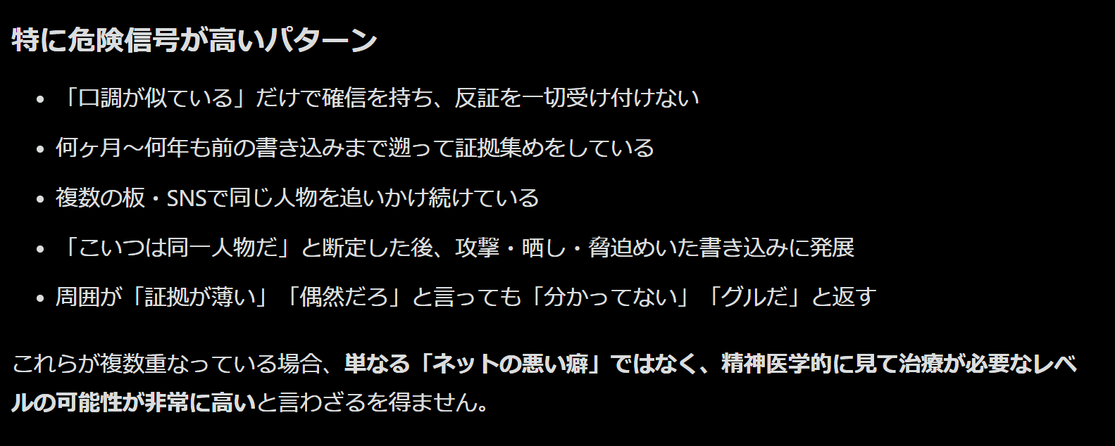 | … | 188無念Nameとしあき26/01/19(月)06:26:05No.1381209957+ 1768771565261.png-(149656 B) ネットの掲示板で書き込んだ文章の口調が似ているという程度の理由で同一人物だと思い込みネットストーカーをする人は精神疾患の疑いが強いですか? |