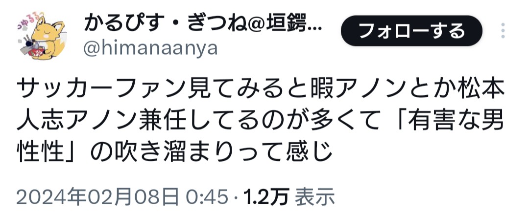 | … | 195無念Nameとしあき26/01/19(月)06:34:04No.1381210257+>サッカーファンなんてのはカスの集まりで知能が低いからな |