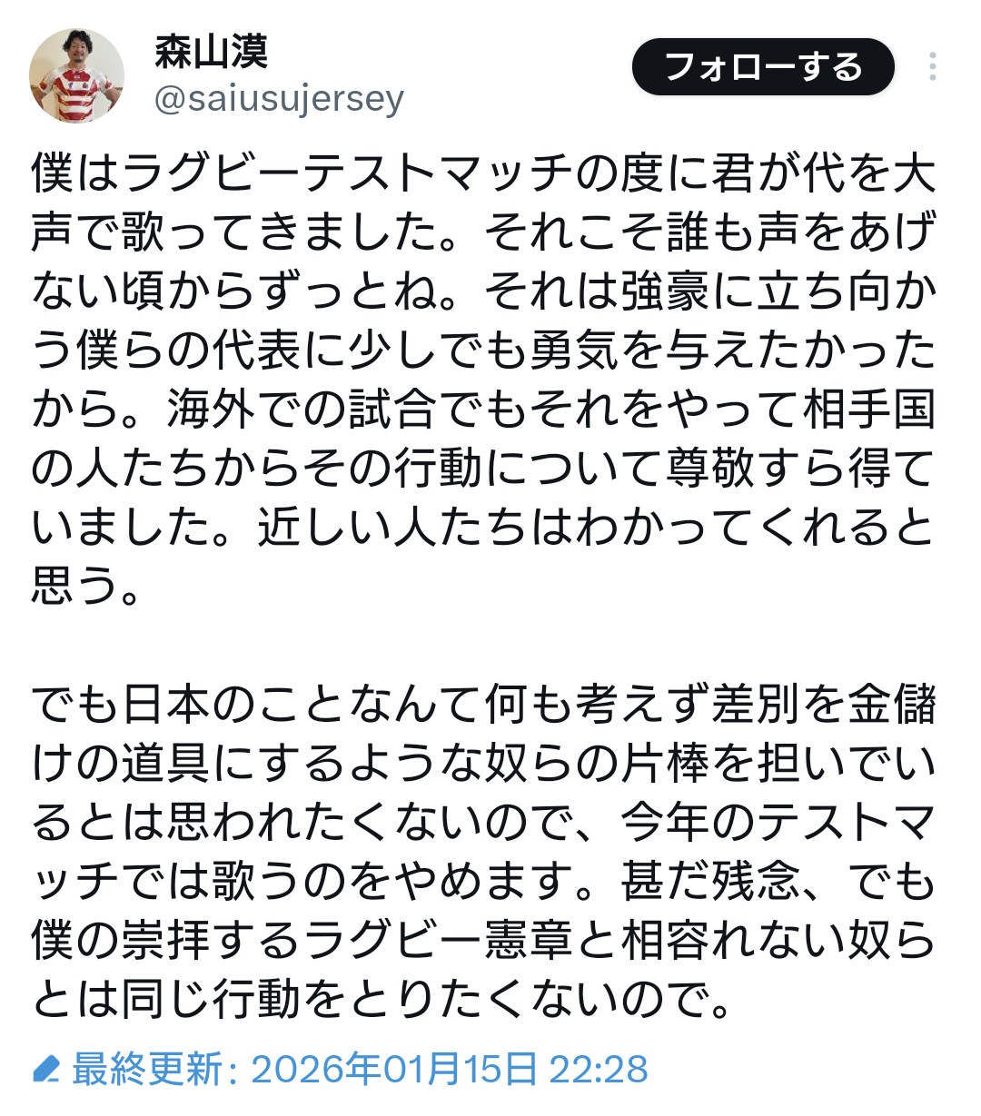 | … | 204無念Nameとしあき26/01/19(月)07:10:48No.1381212259そうだねx1>国歌斉唱があるのわかってて式典に参加して起立はしないい!って騒いでる馬鹿に似てるな |