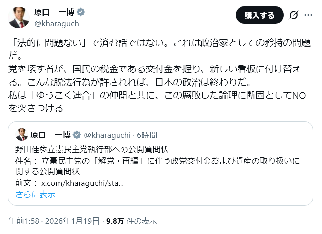 | … | 986無念Nameとしあき26/01/19(月)09:44:58No.1381225525+>立憲に今回の吸収合併でも愛想を尽かさない岩盤支持層がどれだけいるかだな |