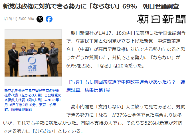 | … | 61無念Nameとしあき26/01/19(月)07:01:27No.1381211636+新党は政権に対抗できる勢力に「ならない」69% 朝日世論調査 |