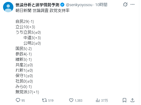 | … | 937無念Nameとしあき26/01/19(月)09:38:58No.1381224924+社民とほぼ横ばいって書くと絶望感あるな |