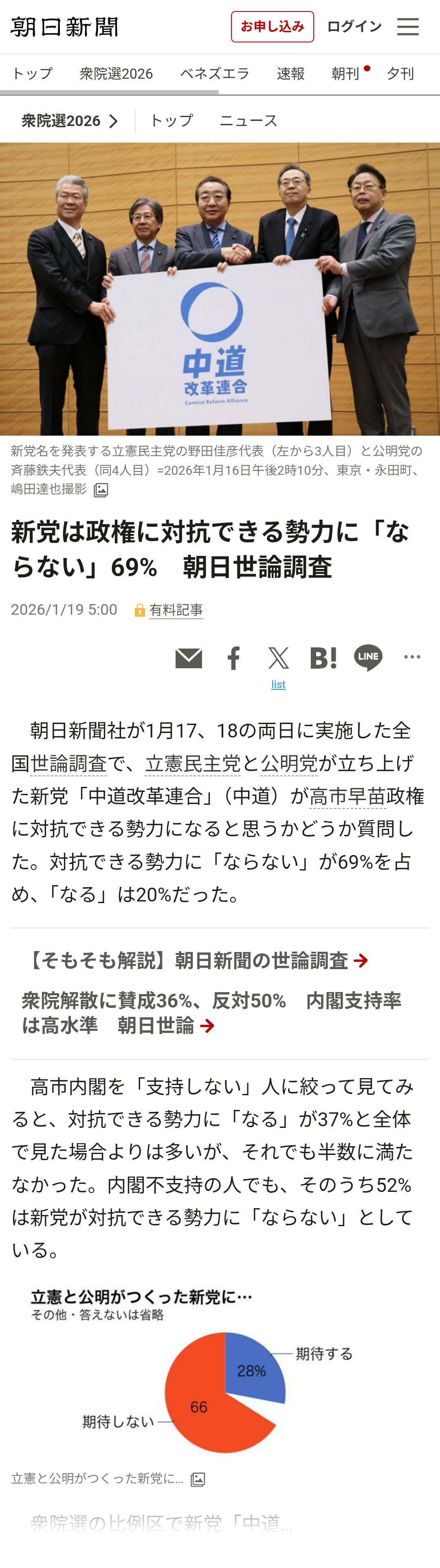 | … | 75無念Nameとしあき26/01/19(月)07:05:14No.1381211873+>新党は政権に対抗できる勢力に「ならない」69% 朝日世論調査 |