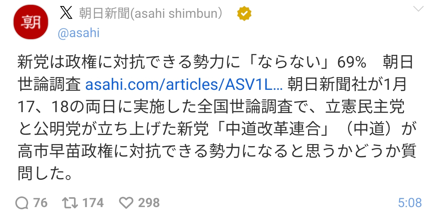 | … | 62無念Nameとしあき26/01/19(月)07:01:57No.1381211660そうだねx2>新党は政権に対抗できる勢力に「ならない」69% 朝日世論調査 |