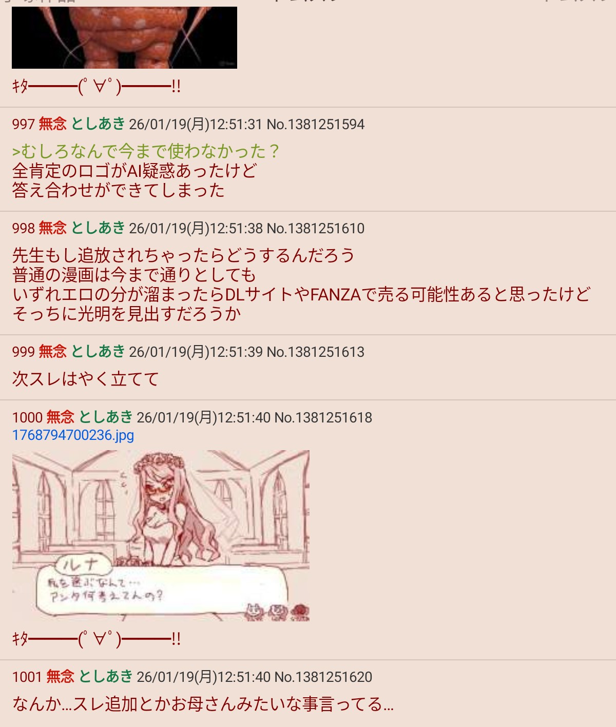 | … | 919無念Nameとしあき26/01/19(月)15:01:24No.1381270924+先生スレッズも微妙にズラして更新してるんだな |