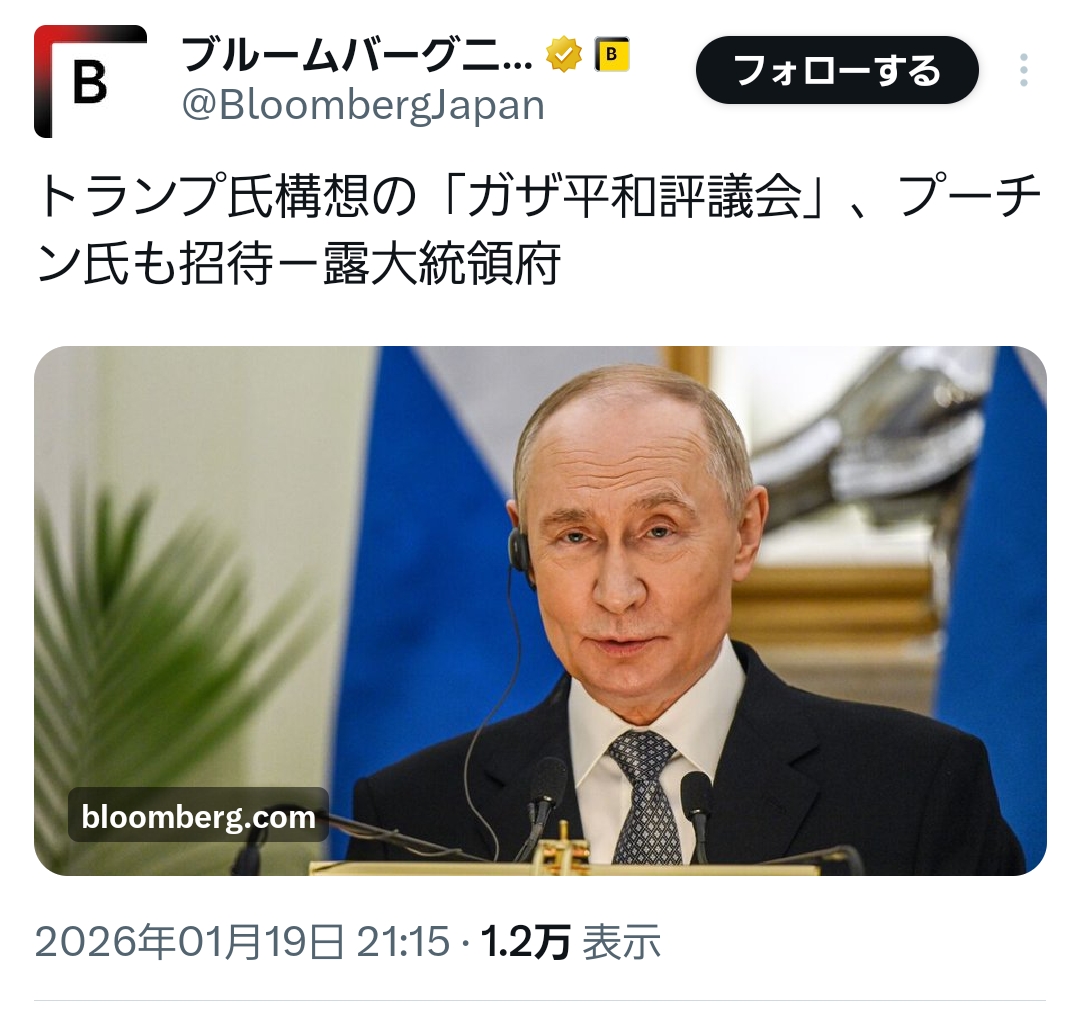 | … | 71無念Nameとしあき26/01/19(月)22:56:11No.1381382157そうだねx10>トランプ1人だけに採決権があるとか言うガザ平和何ちゃら |