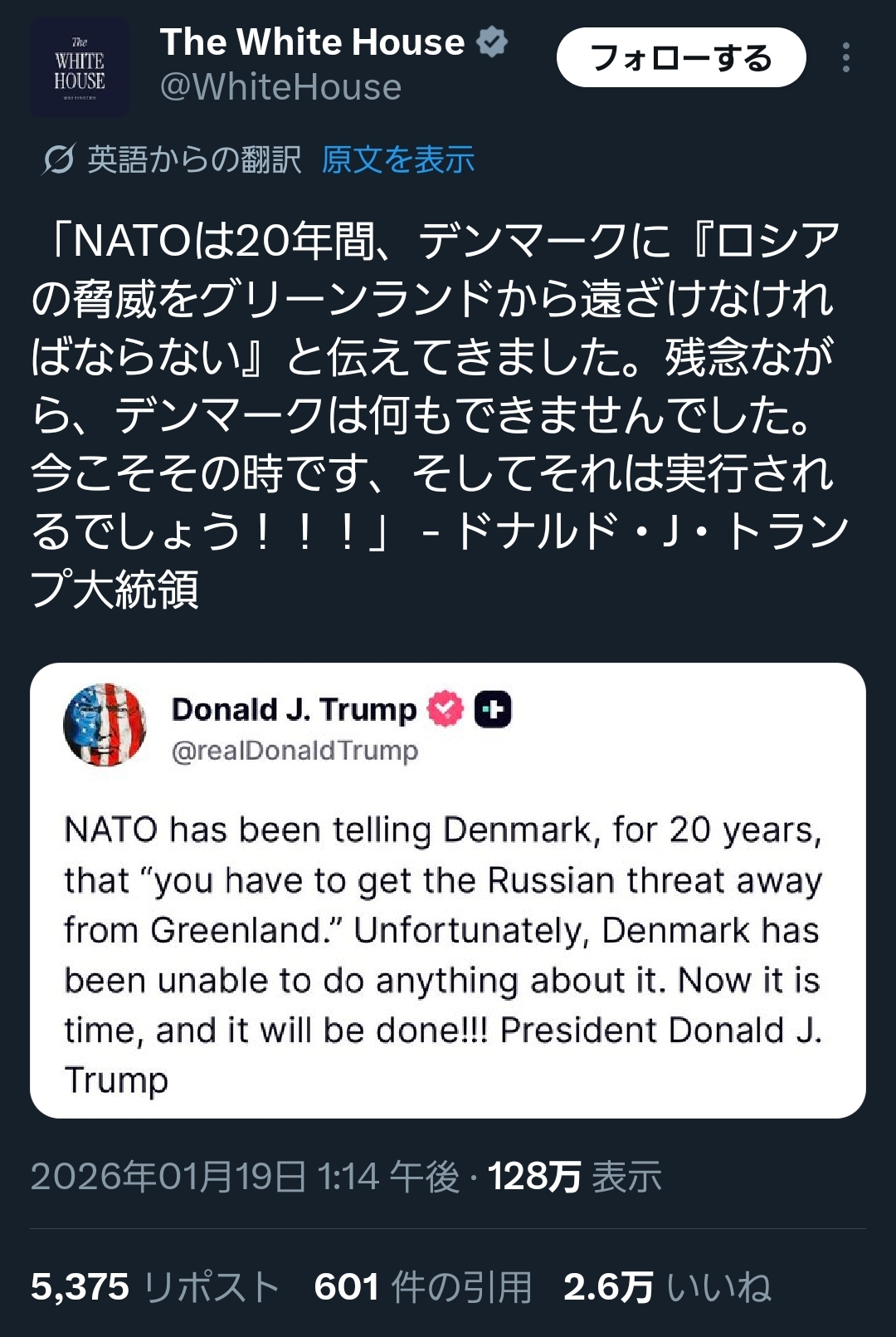 | … | 93無念Nameとしあき26/01/19(月)23:02:34No.1381383793+自国ファーストで良い大統領じゃん |