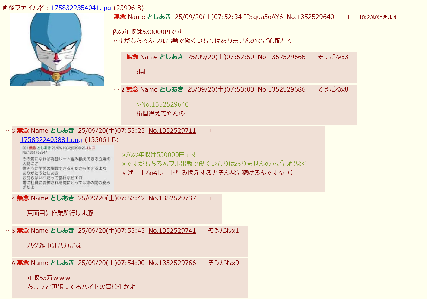 | … | 27無念Nameとしあき26/01/20(火)12:41:03No.1381466467+人並みに稼ぐようになってから言えや汚物が |