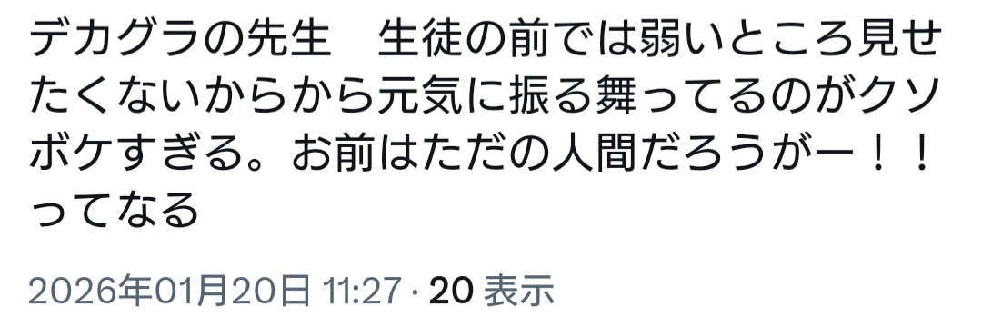 | … | 51無念Nameとしあき26/01/20(火)13:33:41No.1381476055+>デカグラ編の先生は過去のトラウマに苦悩してるらしいわよ! |