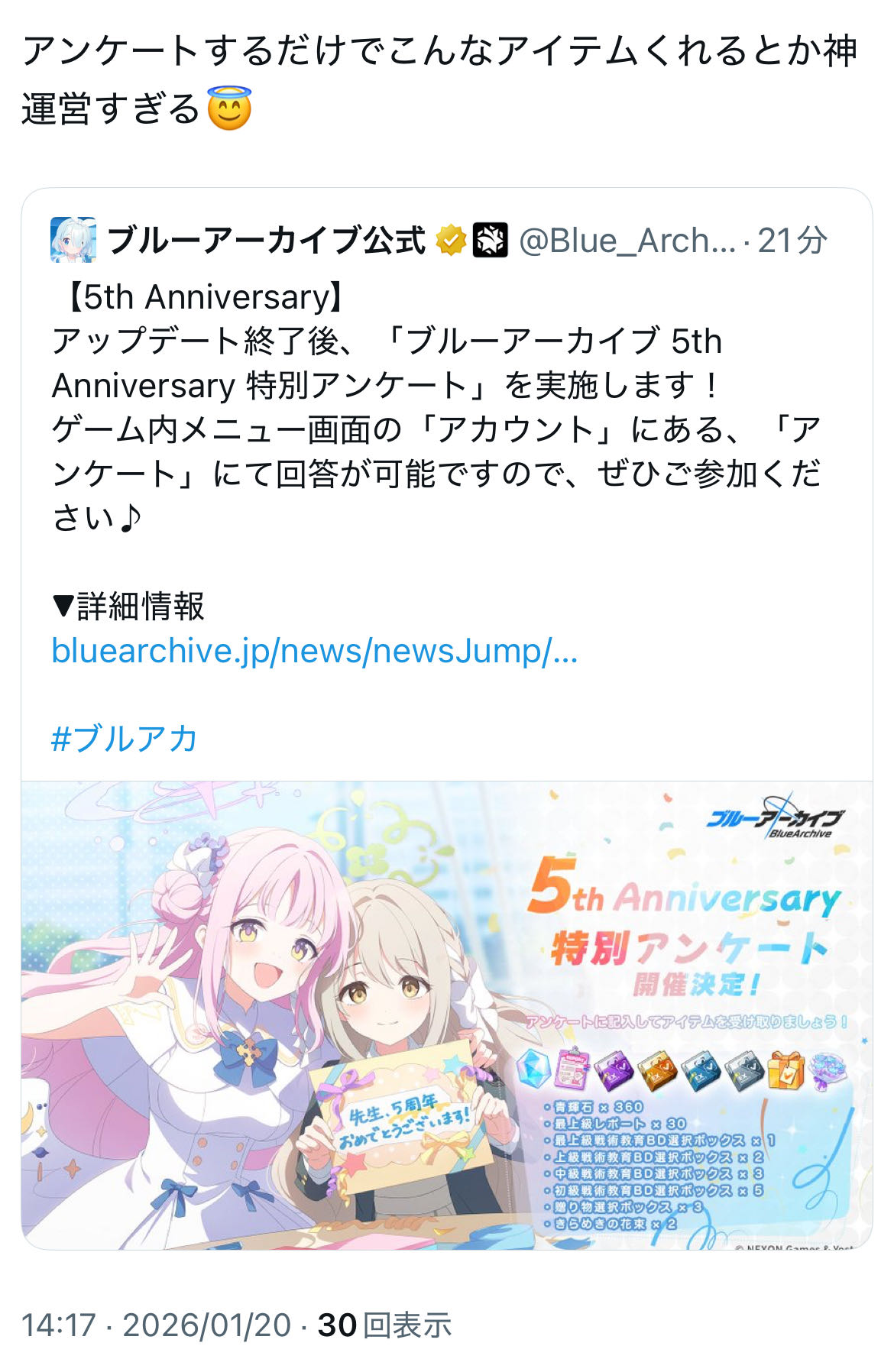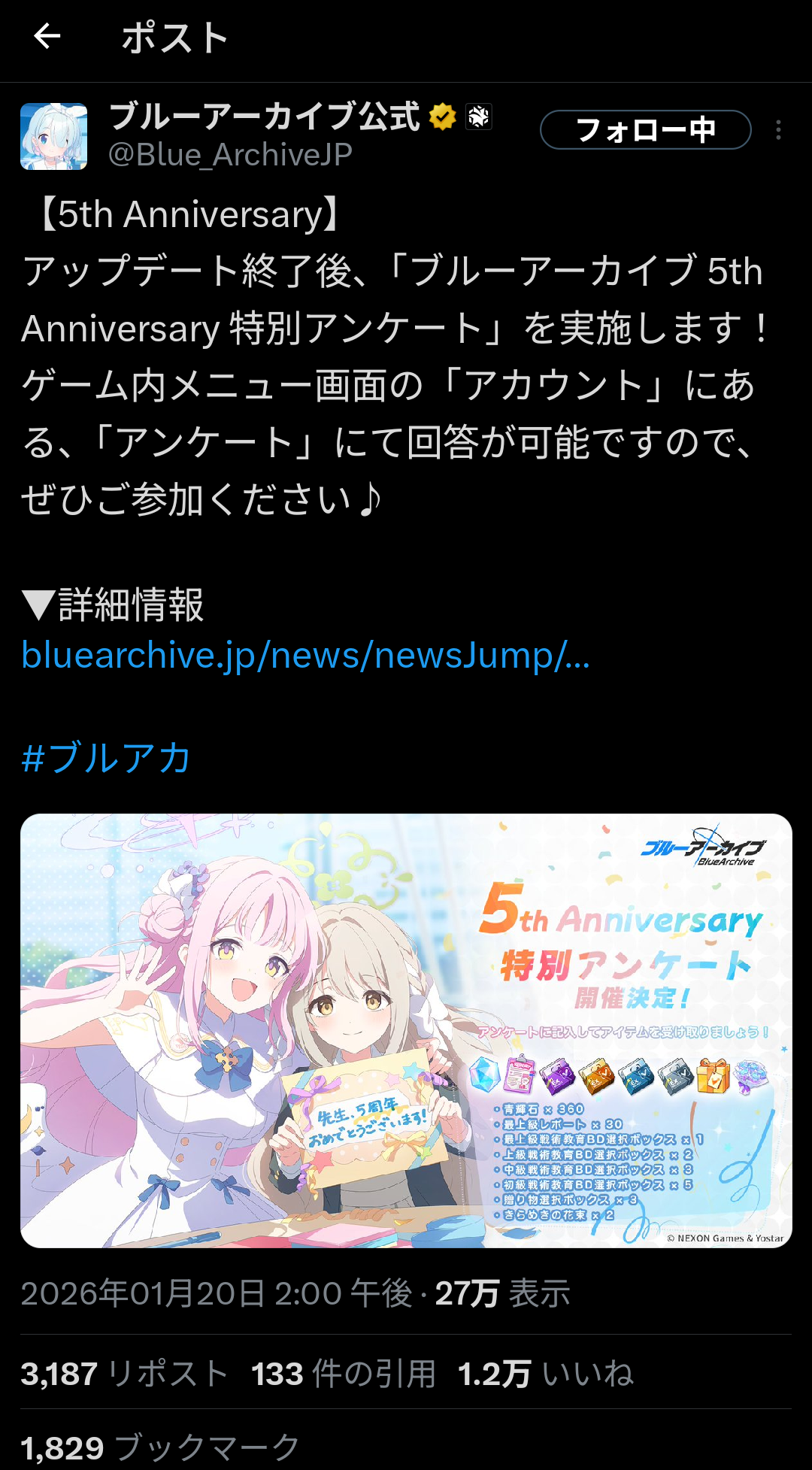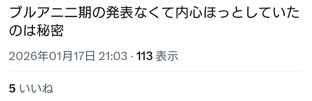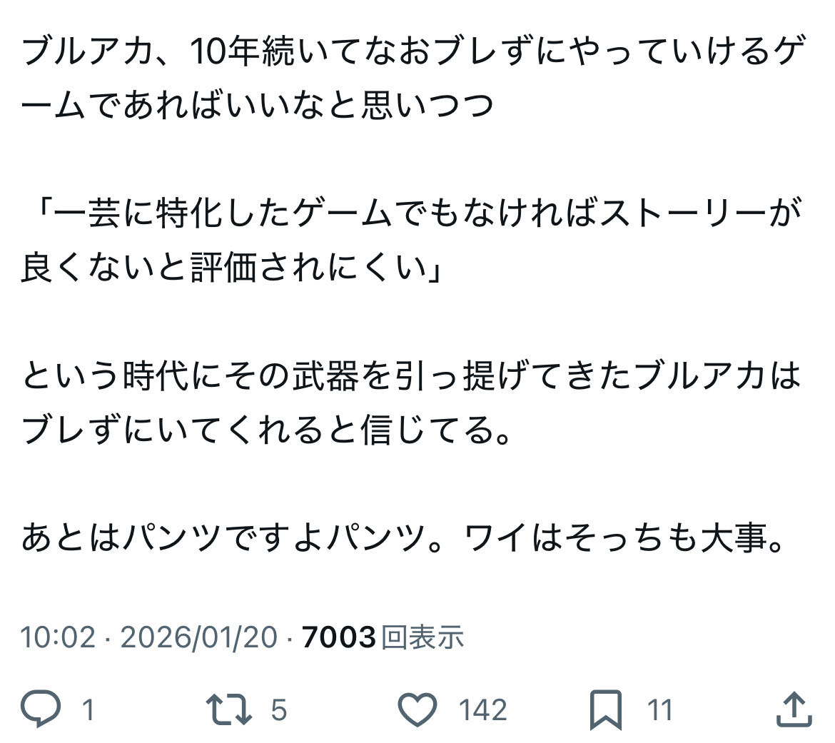| … | 701無念Nameとしあき26/01/20(火)17:36:15No.1381513225そうだねx7 1768898175825.jpg-(32922 B) ブルアカは公式もファンもセルラン意識してるから更新日も時間帯も兎に角空き巣狙いするから面白いのだ |