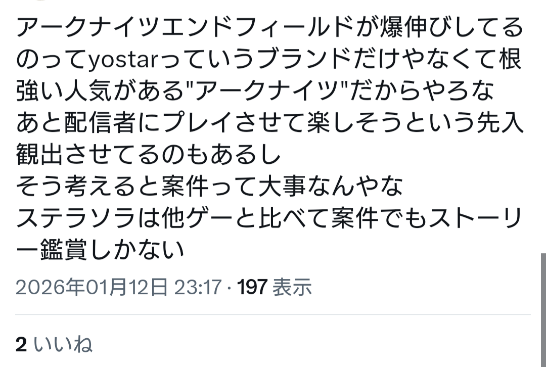 | … | 673無念Nameとしあき26/01/20(火)17:27:53No.1381511819そうだねx3>ブルアカみたいな低スぺでも遊べるゲームやってた層がエンドフィールド耐えられるのか? |