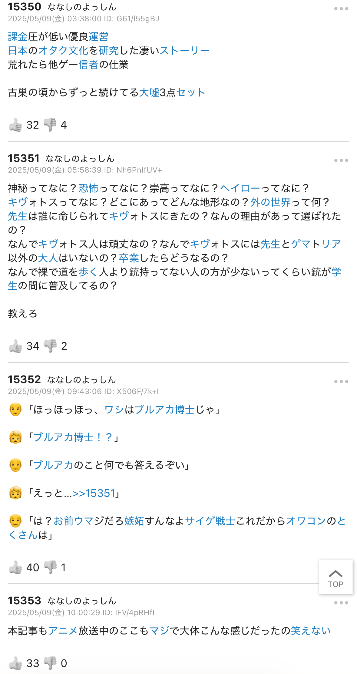 | … | 643無念Nameとしあき26/01/20(火)17:18:32No.1381510329+>ブルアニスレが立っていようがいまいが好きにブルアカスレを立てればいいのでは…? |
