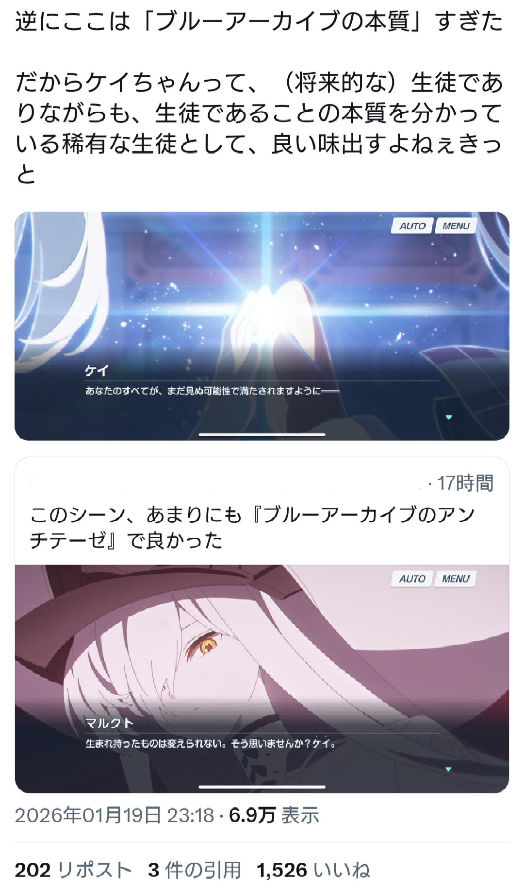 | … | 724無念Nameとしあき26/01/20(火)17:43:40No.1381514522+話中文章やスチルを抜き出してアンチを論破KOな光景はブルアカ界隈では滅多に見ないわよ |