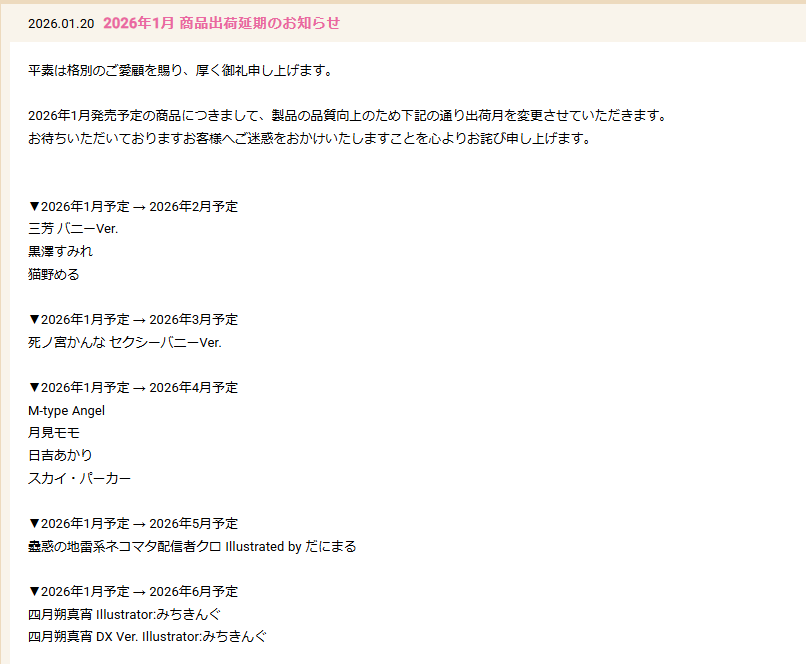 | … | 41無念Nameとしあき26/01/20(火)15:16:34No.1381491847+今月延期して来月になったのが4つほどあるが果たして… |