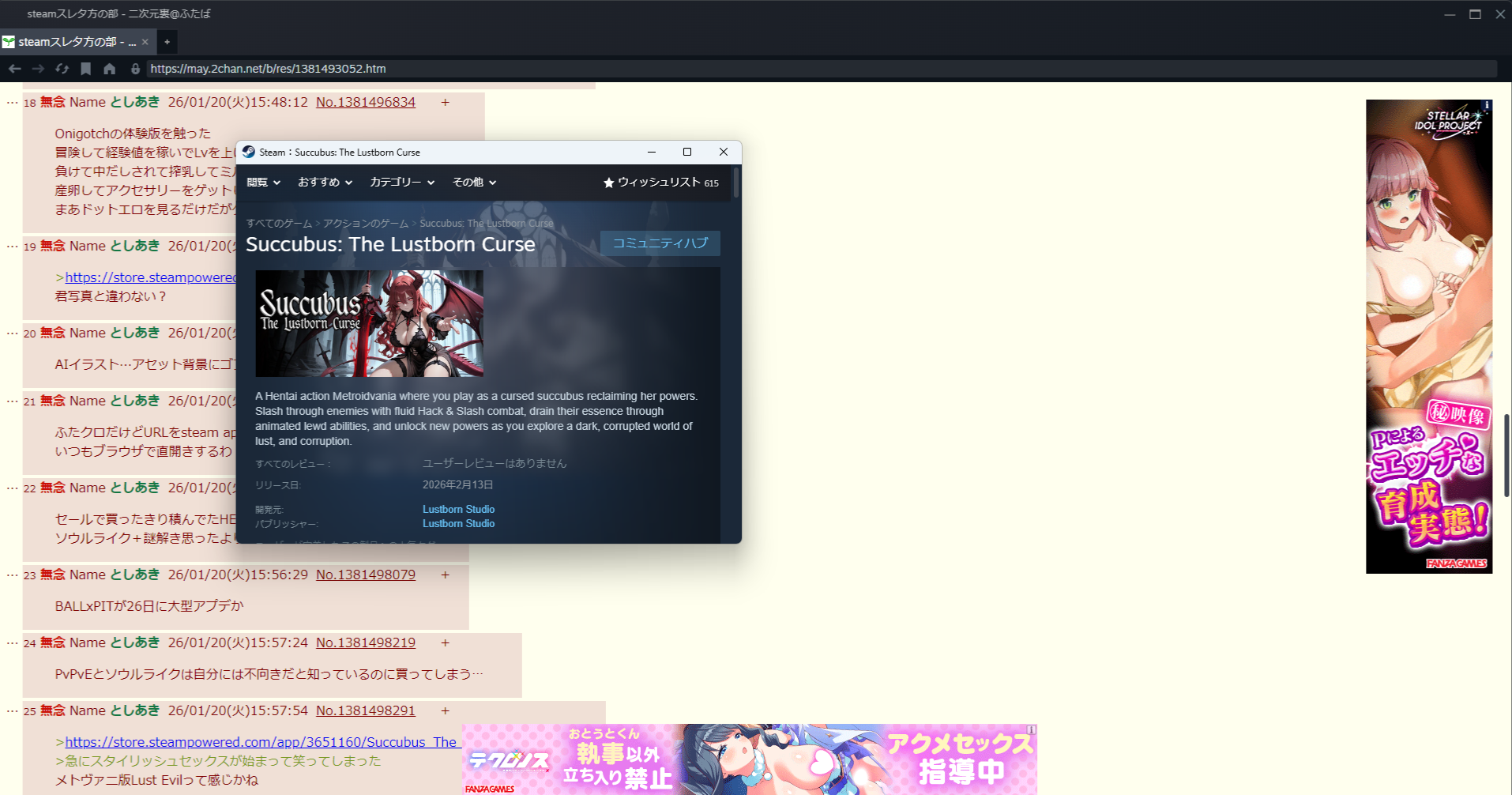 | … | 19無念Nameとしあき26/01/20(火)15:50:33No.1381497192そうだねx1>https://store.steampowered.com/app/3651160/Succubus_The_Lustborn_Curse/ |