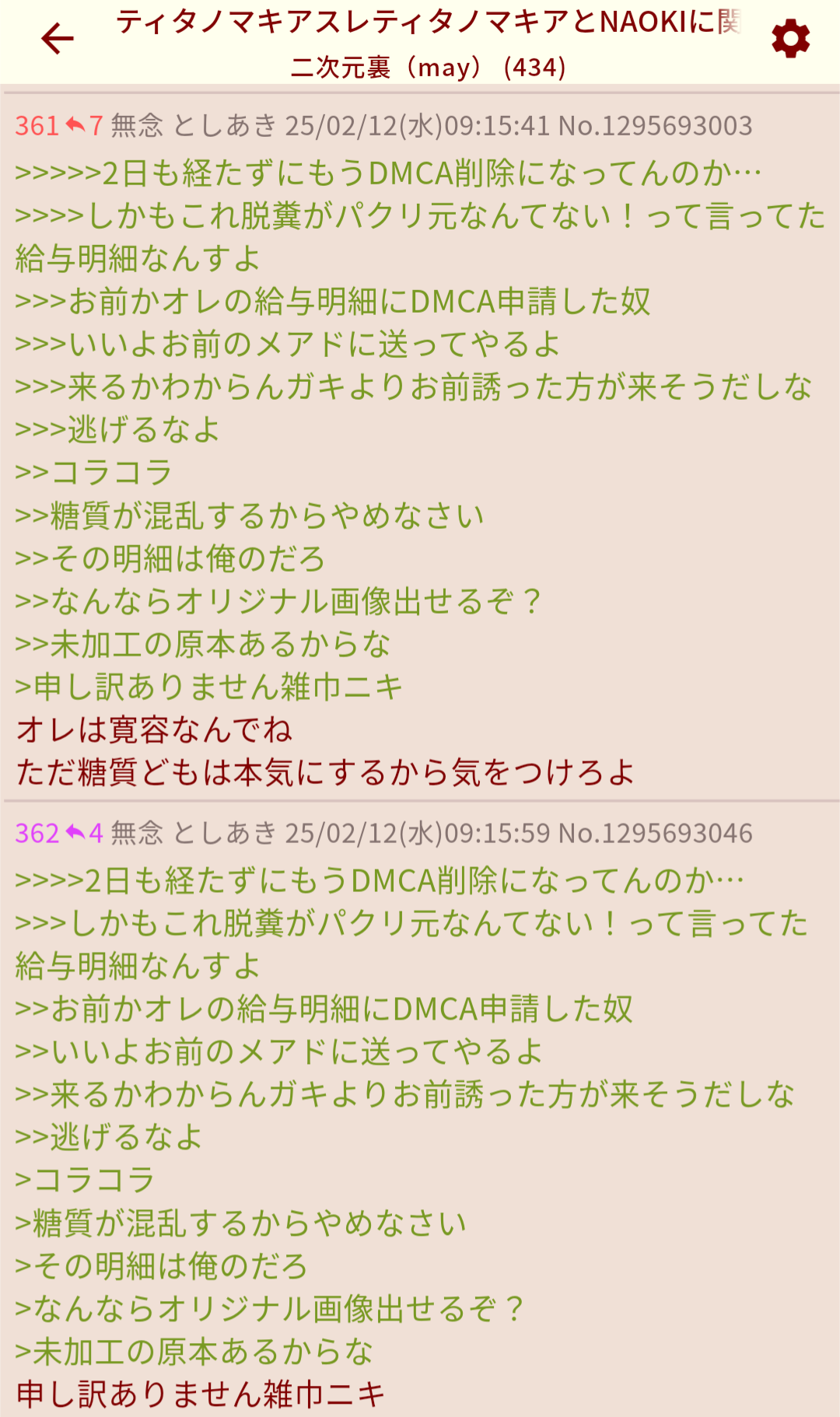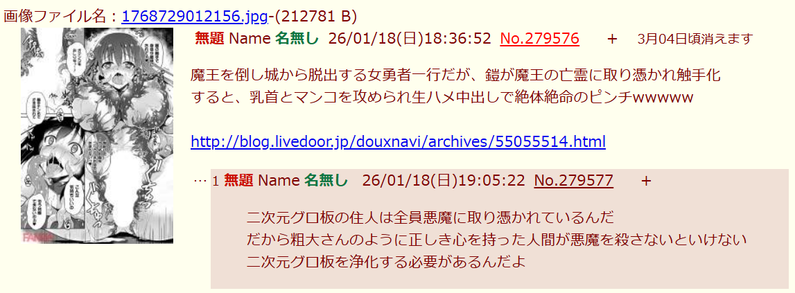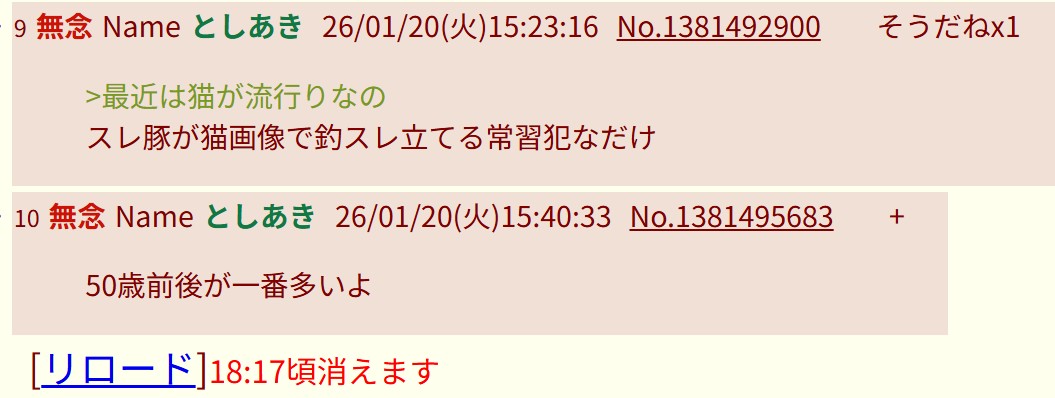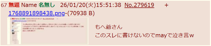 | … | 109無念Nameとしあき26/01/20(火)16:34:28No.1381503633そうだねx1>こいつがスレあきになりすまして自演ミスったような工作してるのバレバレ |