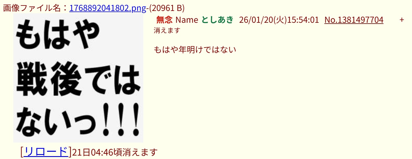 | … | 3無念Nameとしあき26/01/20(火)15:38:42No.1381495391そうだねx14×起きてきた |