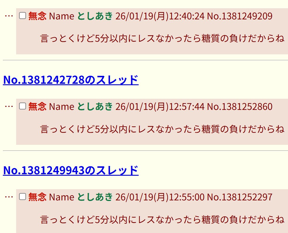 | … | 122無念Nameとしあき26/01/20(火)16:47:12No.1381505460+今日も糖質集団の負け |