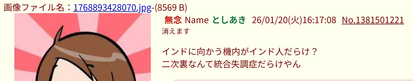 | … | 105無念Nameとしあき26/01/20(火)16:31:24No.1381503195そうだねx4>自演もミスる |