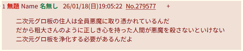 | … | 9無念Nameとしあき26/01/20(火)15:43:56No.1381496195そうだねx8>刑務所収容するべきだと思います |