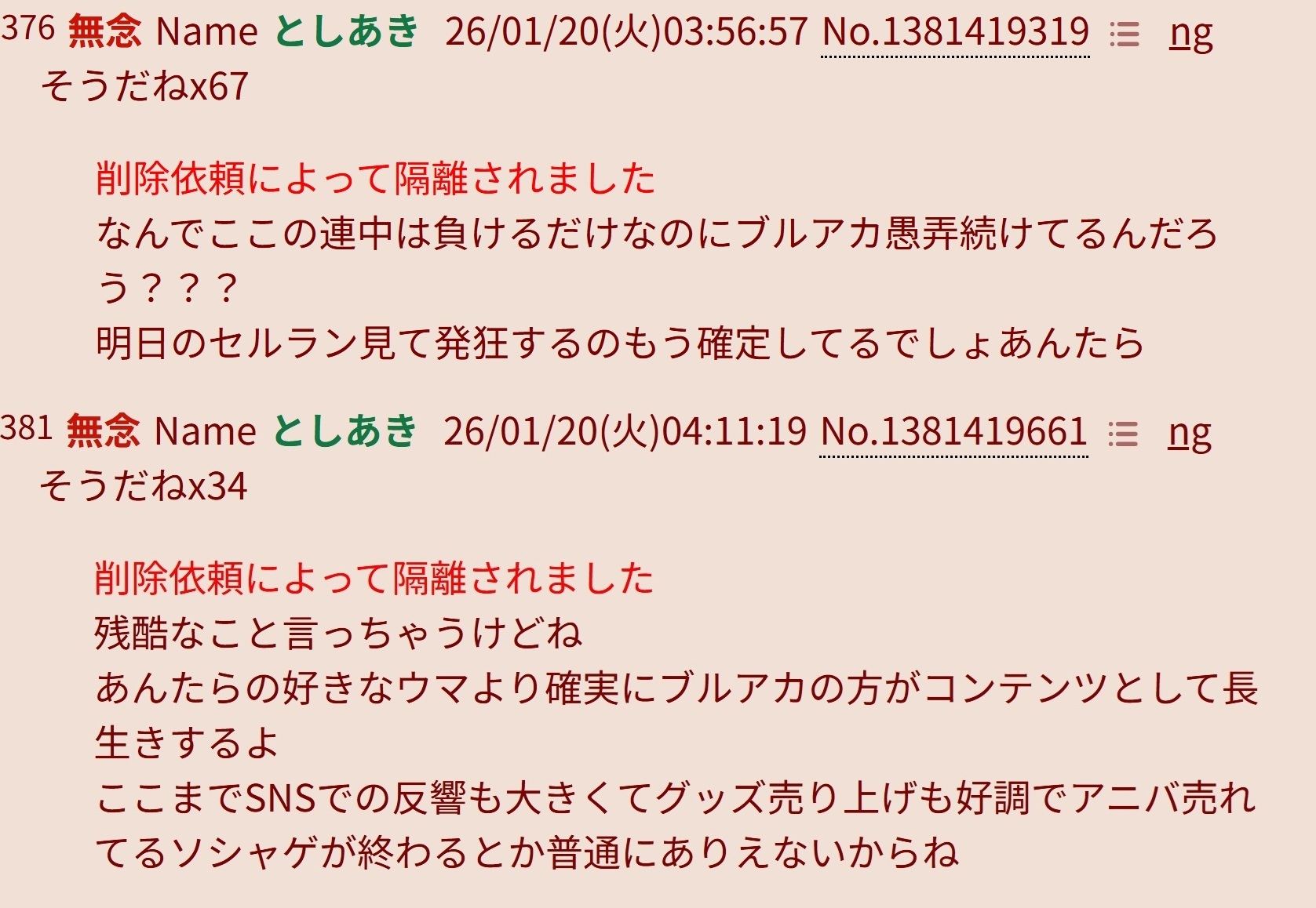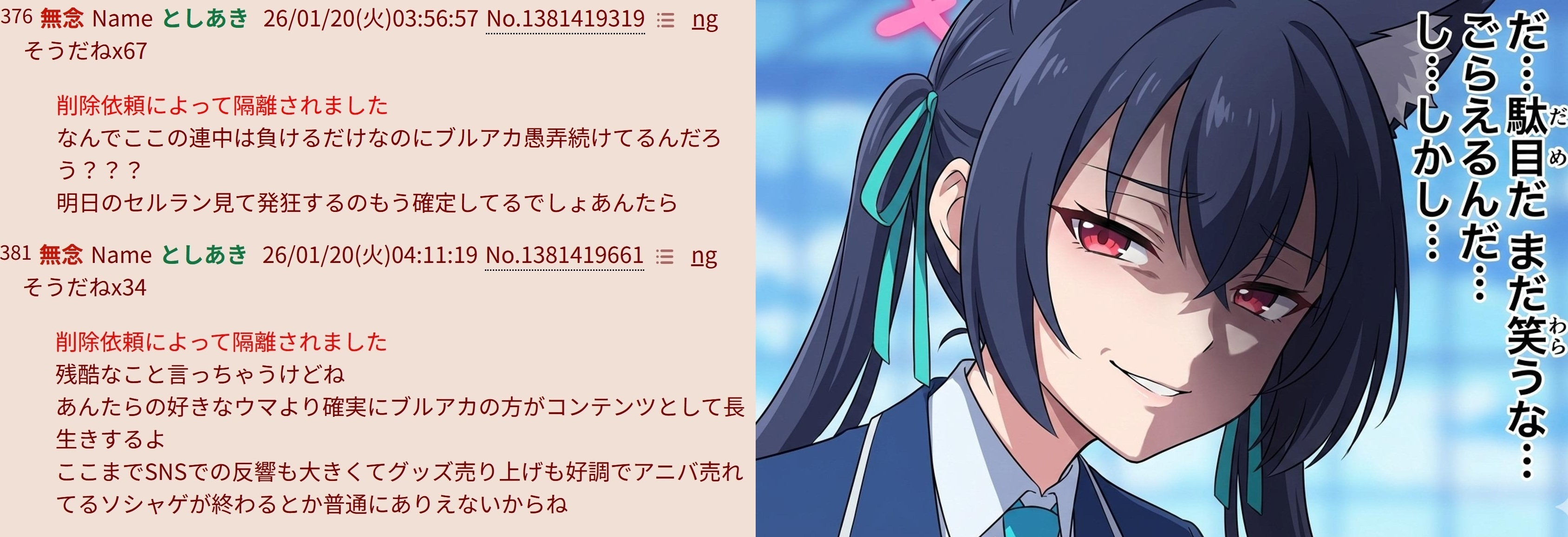| … | 977無念Nameとしあき26/01/21(水)00:50:24No.1381617121そうだねx7ブルアカふぇす放送中でも荒らしてスレ乗っ取ろうとしてなーされたせんせぇだ |