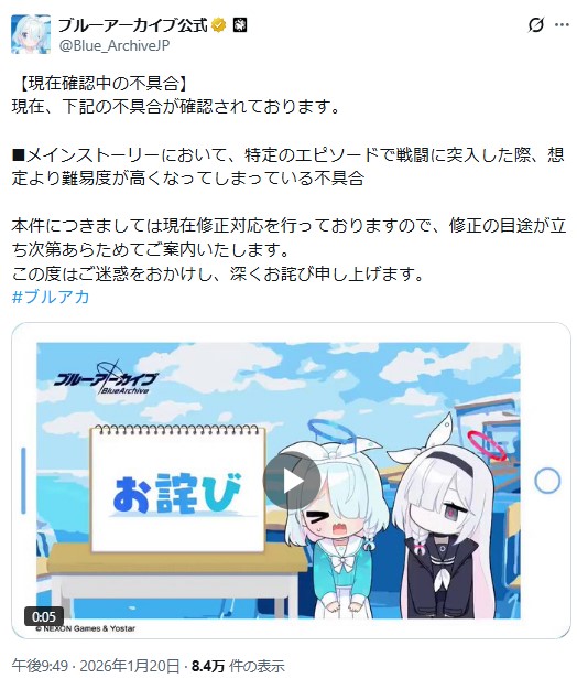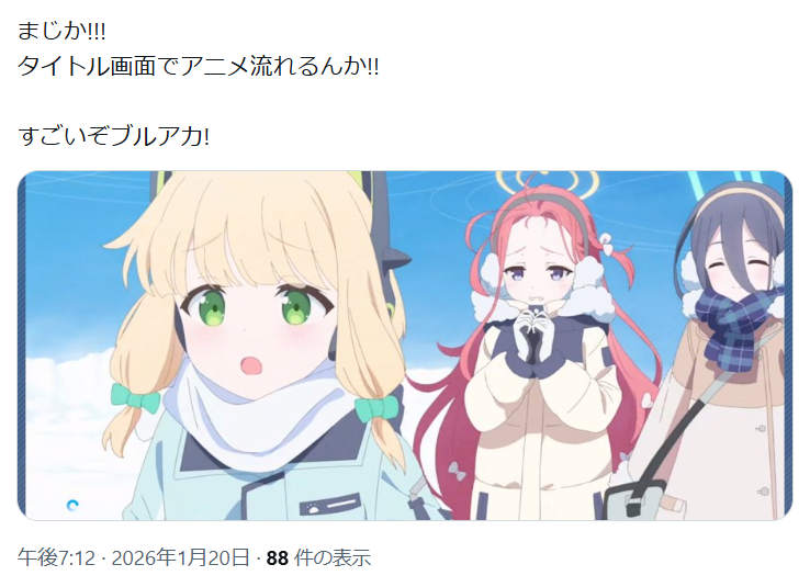 | … | 90無念Nameとしあき26/01/20(火)22:10:19No.1381582714そうだねx2 1768914619074.png-(1095131 B) 「はい!ついにPC版がリリースされたブルーアーカイブ! |