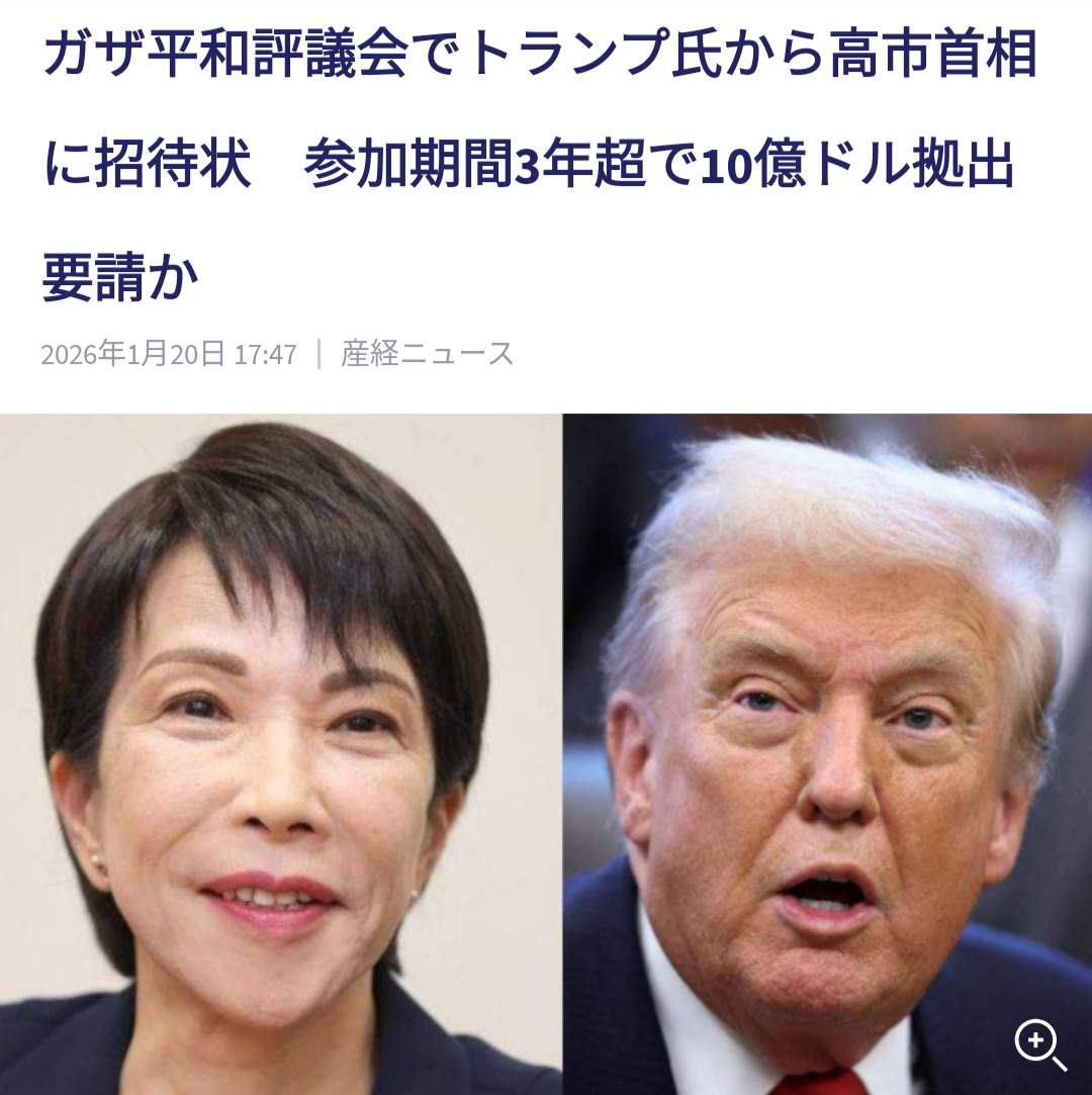 | … | 1無念Nameとしあき26/01/20(火)21:47:27No.1381576778+外務省は20日、トランプ米大統領から高市早苗首相宛てに、パレスチナ自治区ガザの暫定統治などを担う国際機関「平和評議会」への参加を呼びかける招待状が届いていたことを明らかにした。受領は日本時間17日。外務省関係者は今後、参加可否を検討するとしている。 |