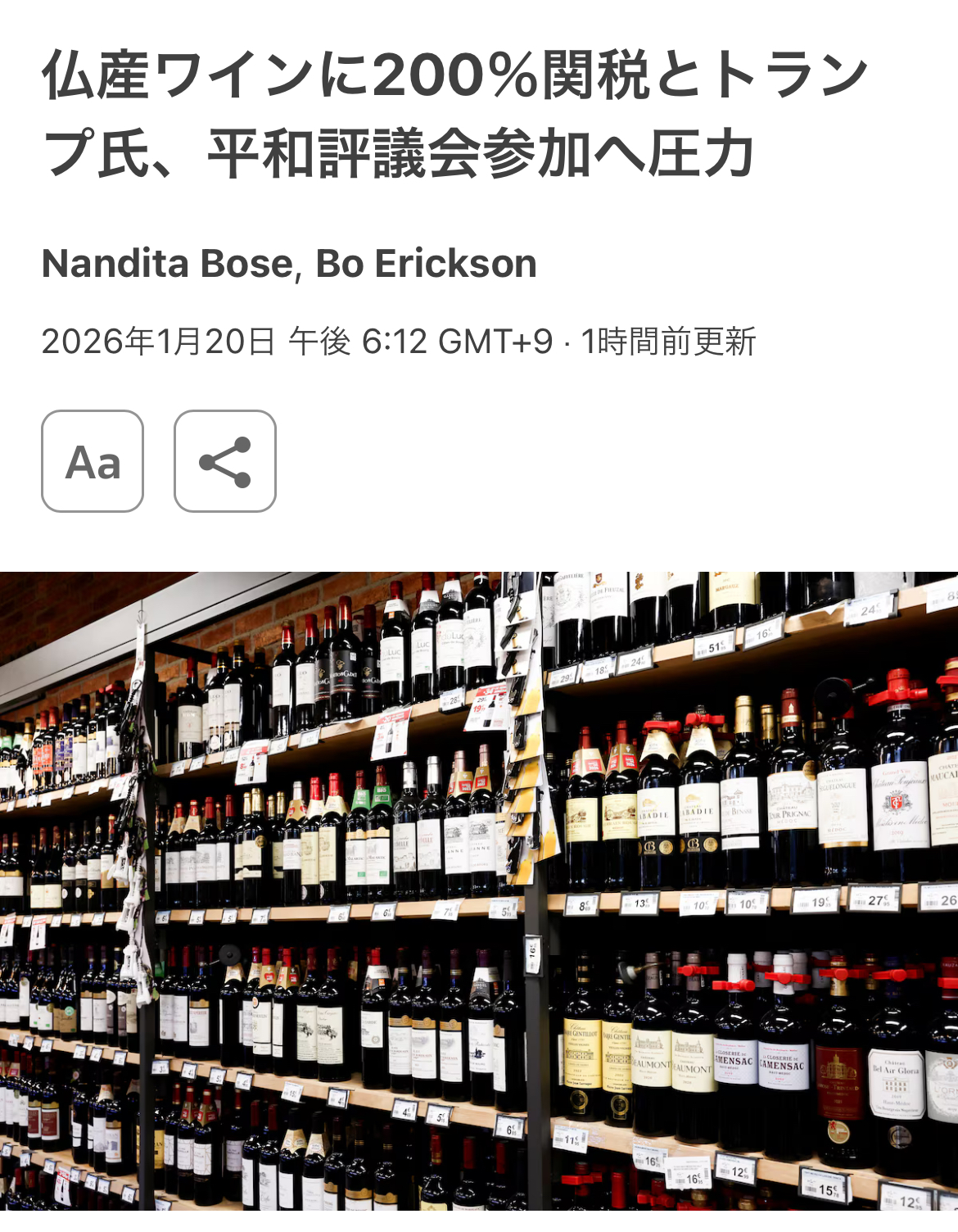 | … | 52無念Nameとしあき26/01/20(火)22:03:59No.1381581080そうだねx1 1768914239151.jpg-(1259937 B) フランスは参加しなければワインとシャンパンに関税200%掛けるぞって脅迫されてる |