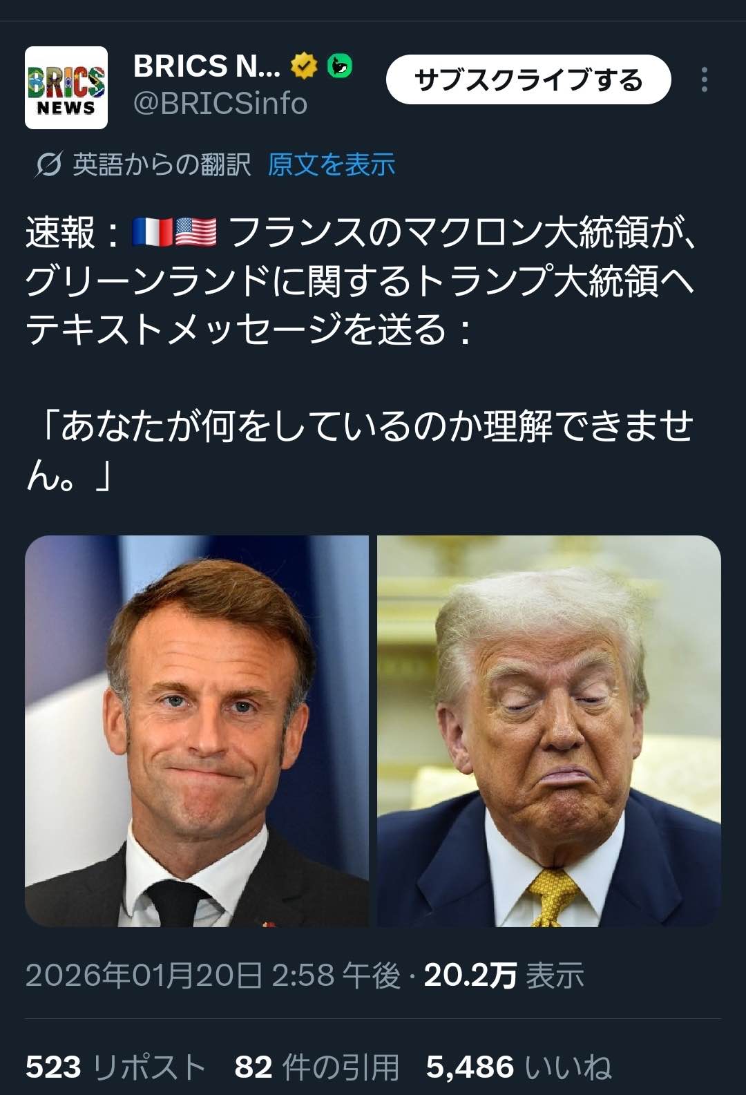 | … | 84無念Nameとしあき26/01/20(火)22:09:15No.1381582417そうだねx1>トランプにそんな理解あると思う? |