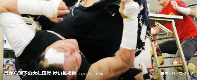 「広島プロレスフェスティバル」のメインイベントに出場し、机上でのテーブルパイルドライバーを失敗し、首から落下。リング上で一時動けなくなり、観客が騒然となっていた。