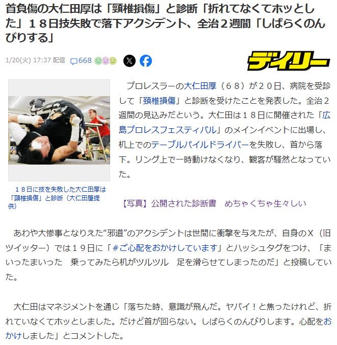 | … | 13無念Nameとしあき26/01/21(水)01:38:48No.1381622906+>プロレスは好きだが怪我多いよなあ |