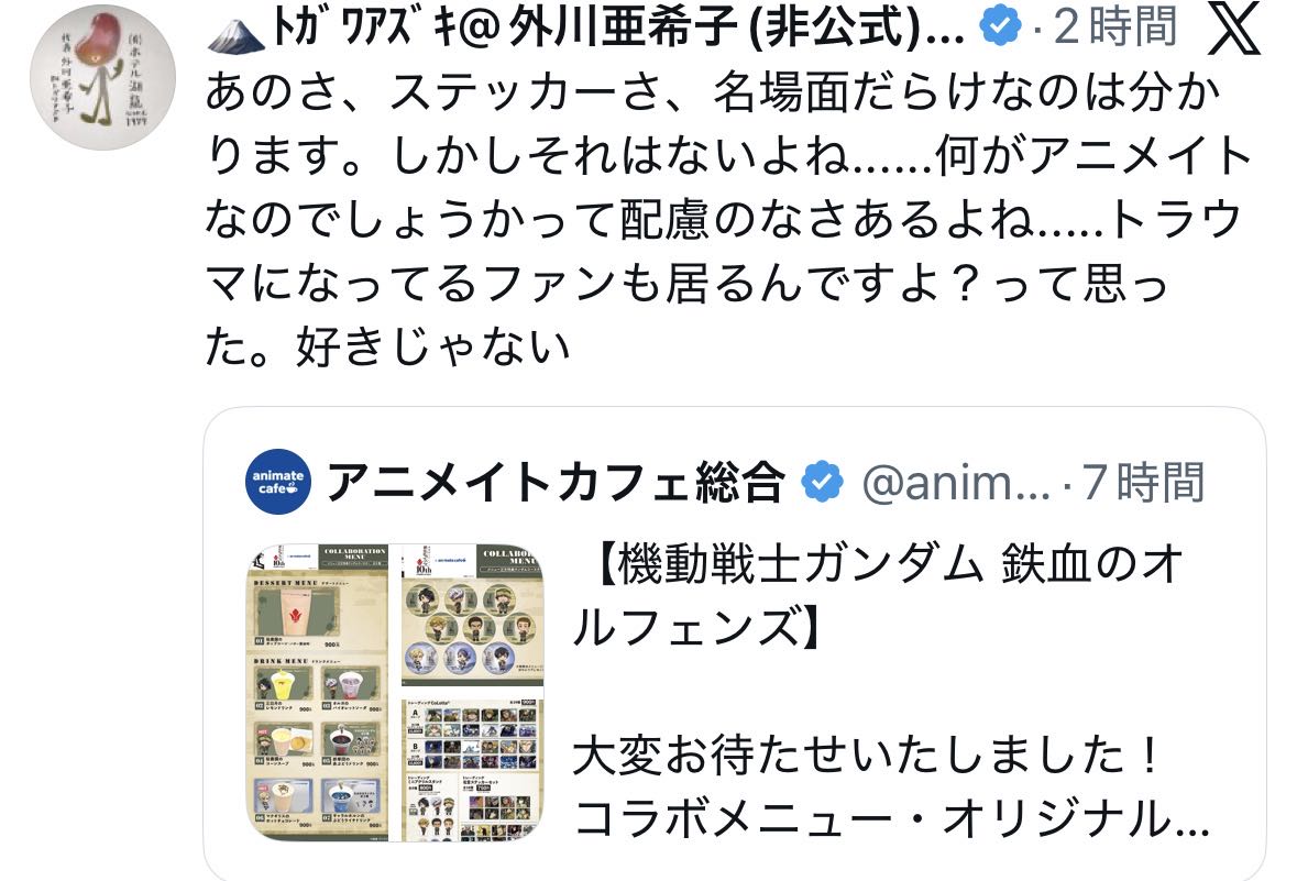 | … | 54無念Nameとしあき26/01/21(水)05:33:31No.1381632830+>>オルガを馬鹿にするアニメイトを許すな! |