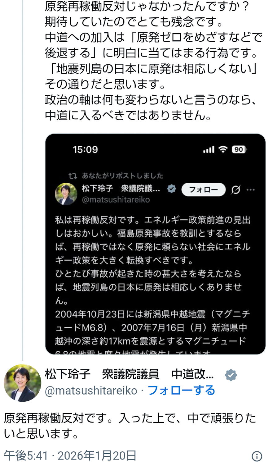 | … | 19無念Nameとしあき26/01/21(水)10:12:08No.1381653930+>原発再稼働反対の立憲民主党・松下玲子 |