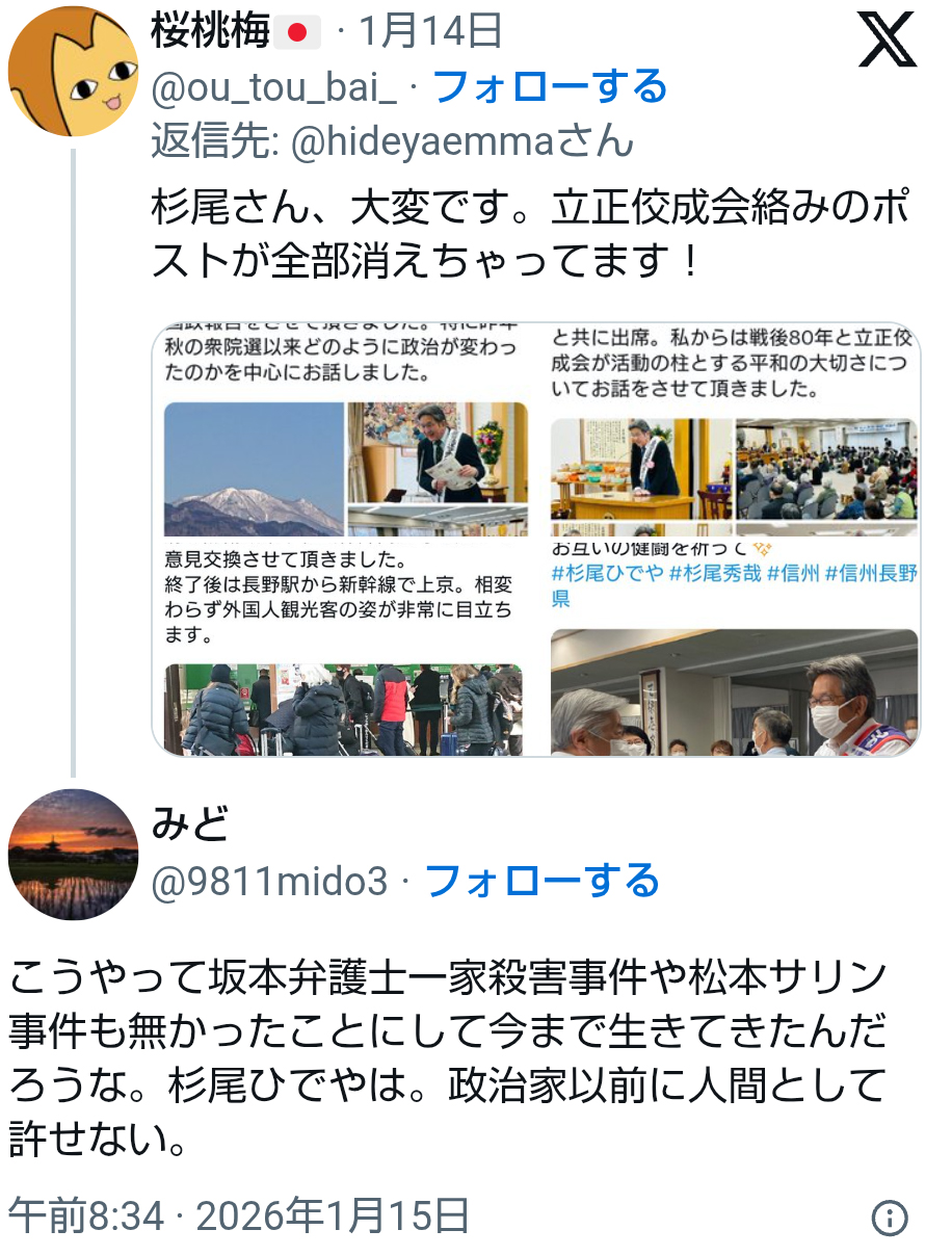 | … | 952無念Nameとしあき26/01/21(水)13:19:38No.1381682225+議員から支持者まで易々とカルトに落ちる馬鹿集団 |