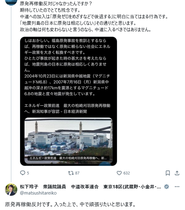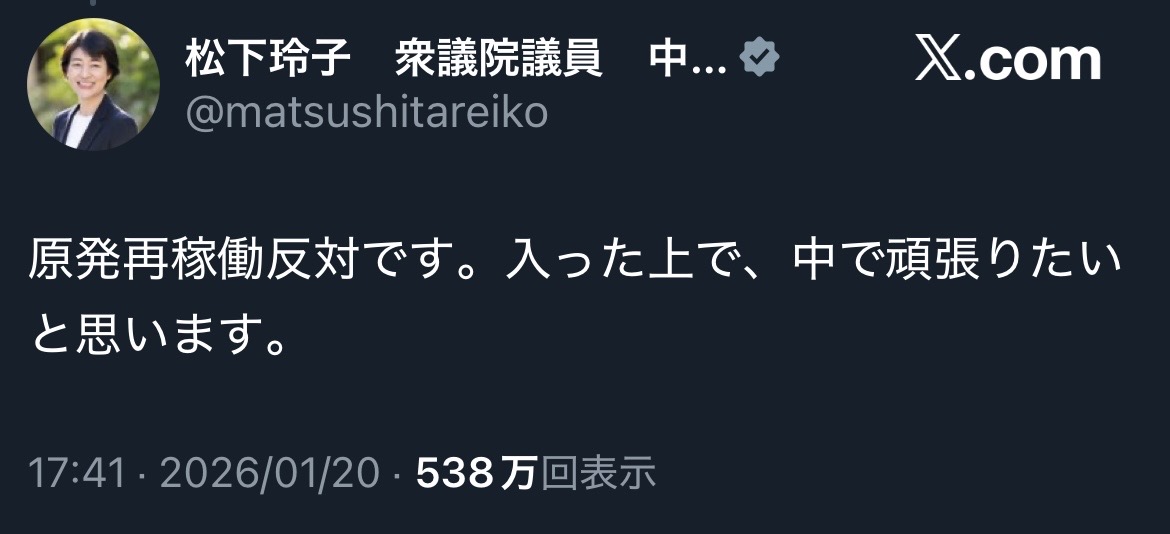 | … | 14無念Nameとしあき26/01/21(水)10:10:07No.1381653673そうだねx17 1768957807780.jpg-(528625 B) 原発再稼働反対の立憲民主党・松下玲子 |